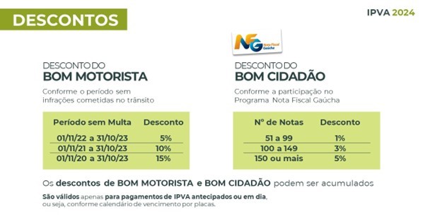 Também em três faixas, a redução no valor do IPVA pelo Bom Cidadão resulta da participação do contribuinte (pessoa física) no Programa da Nota Fiscal Gaúcha (NFG) e a solicitação de notas com CPF na hora da compra.