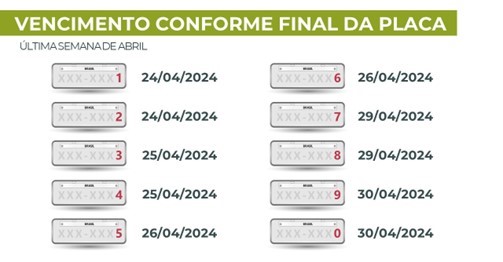 Quem não optar pela antecipação ou pelo parcelamento deverá pagar seu IPVA até a data de vencimento da placa, que se encerra em abril, conforme determinado na lei estadual. O vencimento em 2024 segue a seguinte ordem: